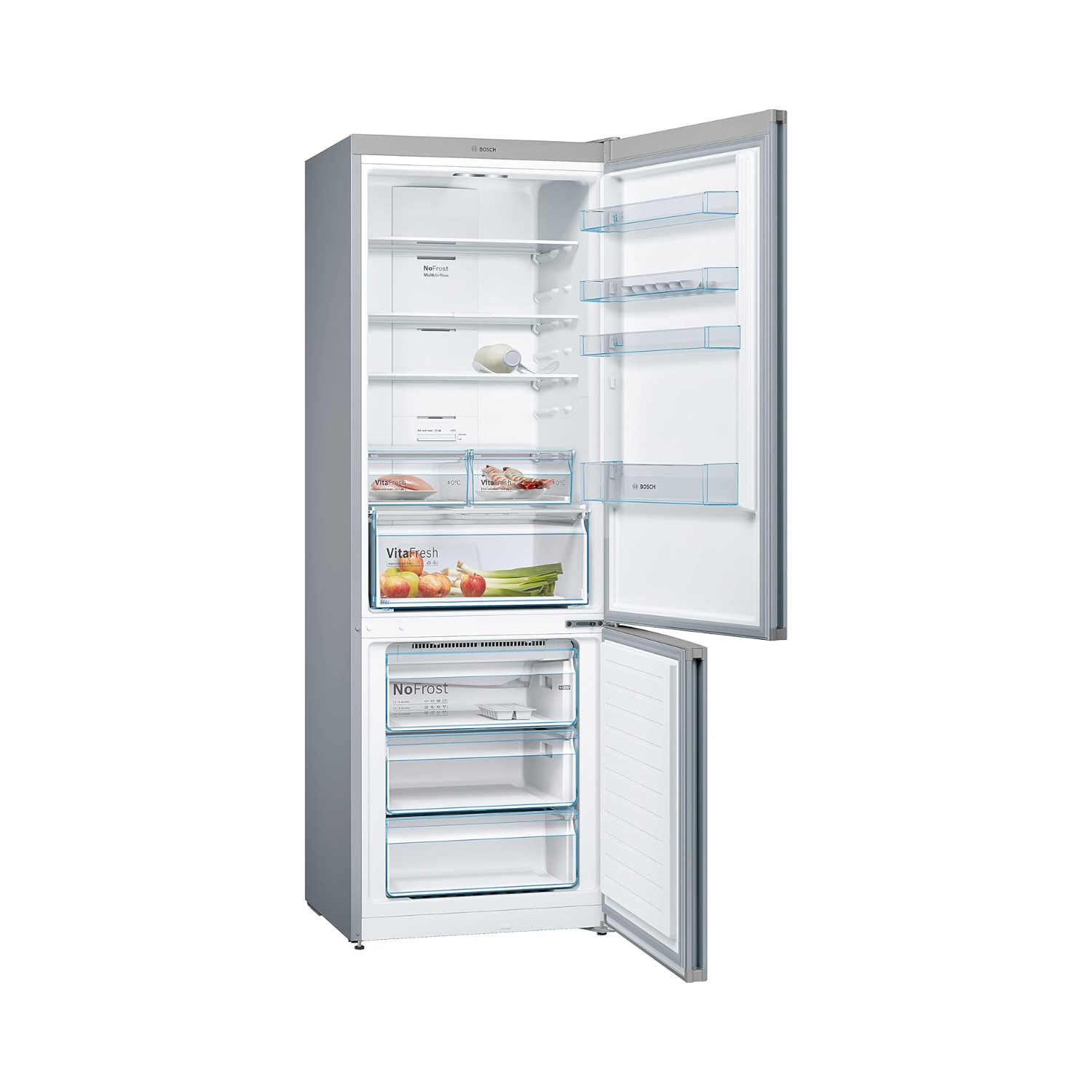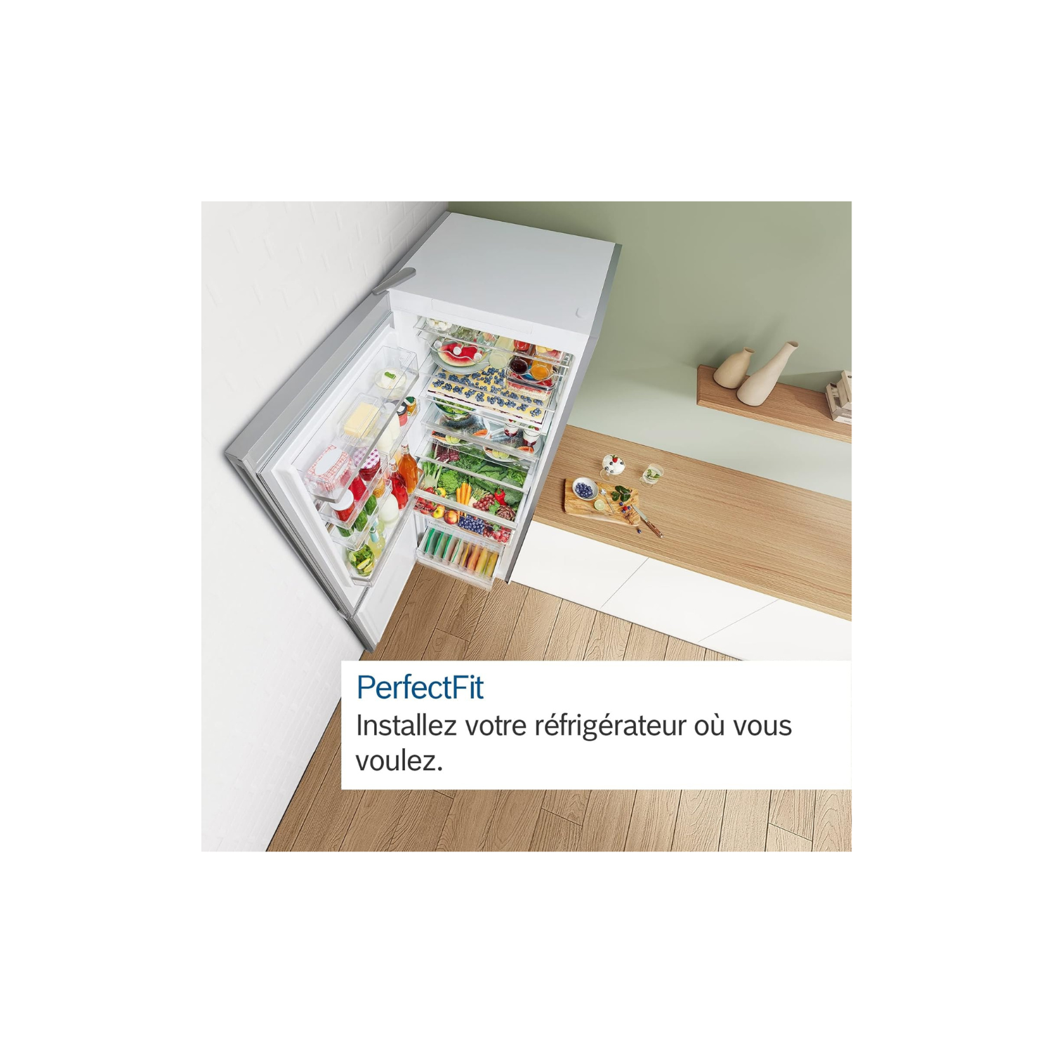 Bosch KGN49XLEA Série 4 – Réfrigérateur Combiné pose-libre – 438 L – 203 x 70 (H x L) – Inox Le réfrigérateur combiné KGN49XLEA de Bosch dispose de la technologie MultiAirFlow , les fluctuations de température sont minimisées et les temps de refroidissement réduits – ce qui aide vos aliments à conserver leur fraîcheur plus longtemps. Afin que votre appareil consomme moins d’énergie des capteurs internes et externes contrôlent en permanence la température du réfrigérateur afin que le compresseur adapte sa puissance à la situation. Le système fraîcheur VitaFresh crée les conditions idéales de stockage pour tous vos aliments frais grâce au degré réglable de l’humidité. Le degré d’humidité dans le tiroir peut être réglé de telle sorte que vos fruits et légumes resteront frais plus longtemps. Caractéristiques produit : Volume total : 438 l Classe d’efficacité énergétique E sur une échelle allant de A à G Consommation énergétique : 259 kWh/an NoFrost MultiAirflow Régulation électronique avec affichage LED de la température Chaque zone de température contrôlable et réglable séparément Dégivrage automatique dans le réfrigérateur Eclairage LED à intensité progressive (SoftStart) dans le réfrigérateur Alarme visuelle et sonore de porte ouverte Alarme visuelle et sonore de température dans le congélateur Réfrigérateur : Volume 330 l Super-réfrigération avec arrêt automatique 5 clayettes en verre de sécurité (4 réglables en hauteur) 1 grands et 3 petits balconnets Congélateur : Volume 108 l Super-congélation avec arrêt automatique Pouvoir de congélation : 12 kg en 24h 3 tiroirs de congélation transparents VarioZone avec clayettes amovibles en verre de sécurité Autonomie en cas de coupure électrique : 16 h Bosch – Des technologies pour la vie: Bosch a pour mission de rendre la vie plus facile en proposant des équipements fiables, efficaces, et agréables à utiliser, pour vous assurer plus de tranquillité d’esprit dans votre vie quotidienne. Bosch fut fondé en 1886 lorsque Robert Bosch ouvrit son premier atelier d’ingénierie à Stuttgart, en Allemagne. Des décennies plus tard, la marque s’est imposée comme une référence de l’électroménager grâce à ses appareils à la pointe de la technologie et à la qualité toujours plus reconnue.