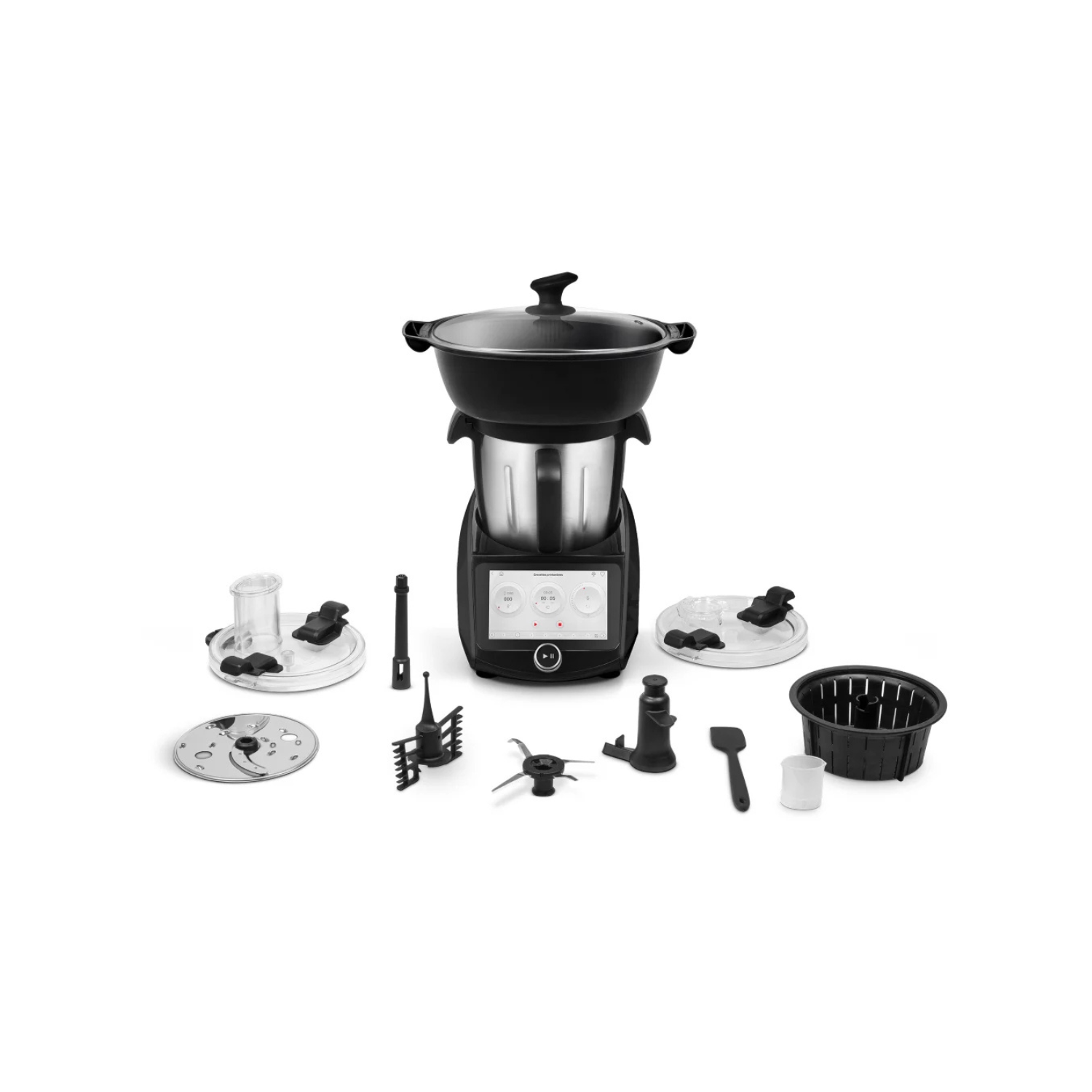 Accessoires : couvercle anti-projections, découpe légumes, disque(s) éminceur, disque(s) râpeur, emulsionneur, lame de pétrissage, lame universelle, mélangeur, panier vapeur, balance intégrée